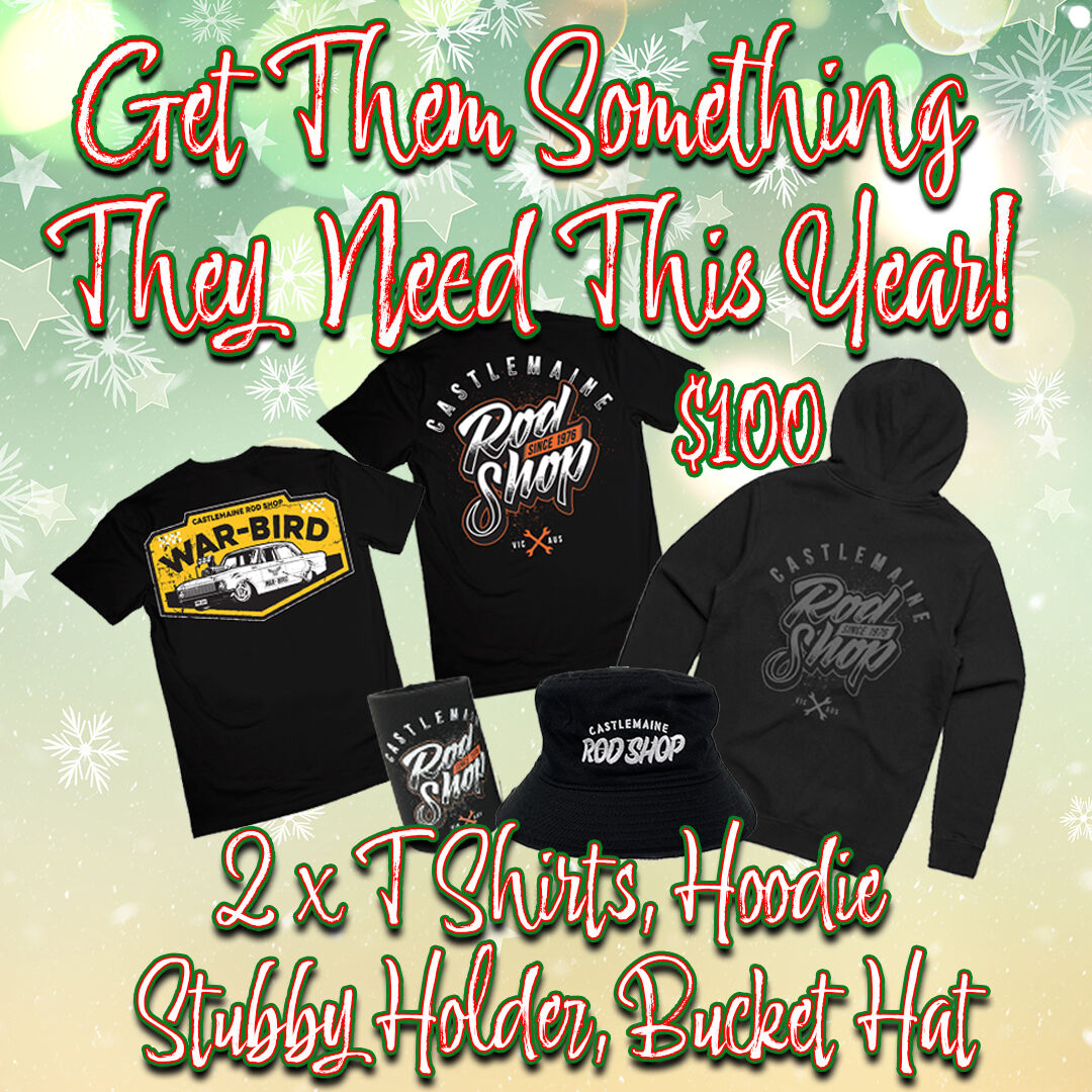 | 1 x Hoodie - Your Choice 2 x T Shirts - Your Choice 1 x Rod Shop Stubby Holder 1 x Rod Shop Bucket Hat |